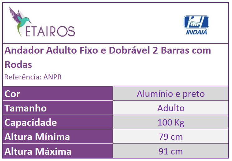 Alumínio Anodizado; Tubo de Aço; Pino; Rebite; Parafuso; Porca; Arruela; Manopla, Conexões e Roda de Polipropileno; Borracha. Capacidade: 100 Kg | |