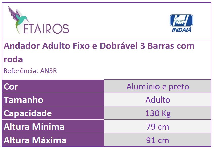 Alumínio Anodizado; Tubo de Aço; Pino; Rebite; Manopla e Conexões de Polipropileno; Borracha. Capacidade: 130 Kg | |