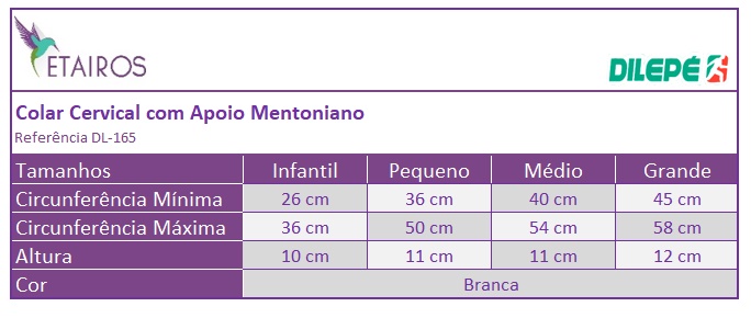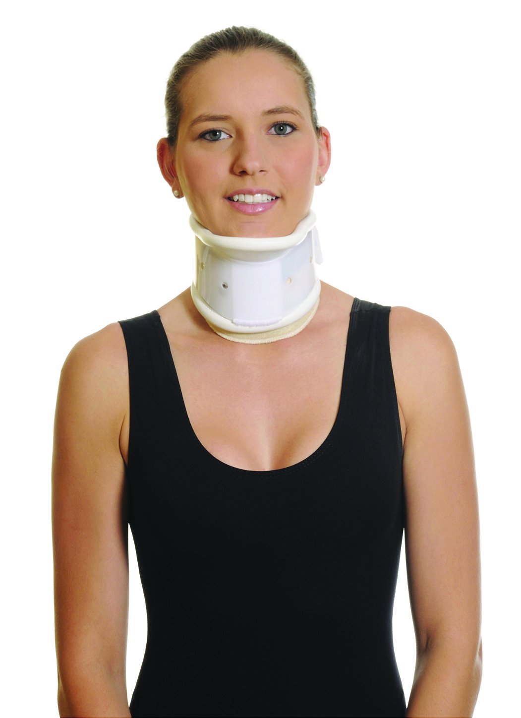 Confeccionado em plástico flexível, estofado nas bordas, apoio mentoniano para reduzir os movimentos, almofada sobre o esterno, ajuste na altura com fecho em velcro. | |